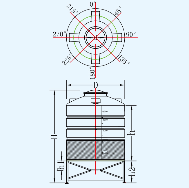 | 名稱(chēng) | 型號(hào) | 容量L | 桶體直徑D | 人孔直徑d | 總腳高度H | 垂高h(yuǎn) | 腳高h(yuǎn)1 | 錐高h(yuǎn)2 | 平均厚度mm |